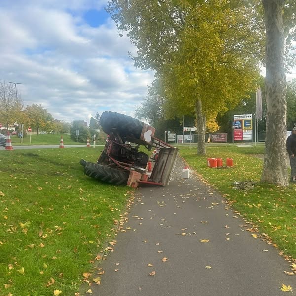 Gemeldet wurde ein Traktorunfall bei dem das Fahrzeug einen Abhang hinabgestürzt ist und schließlich auf dem darunterliegenden Fahrradweg zum Liegen kam.